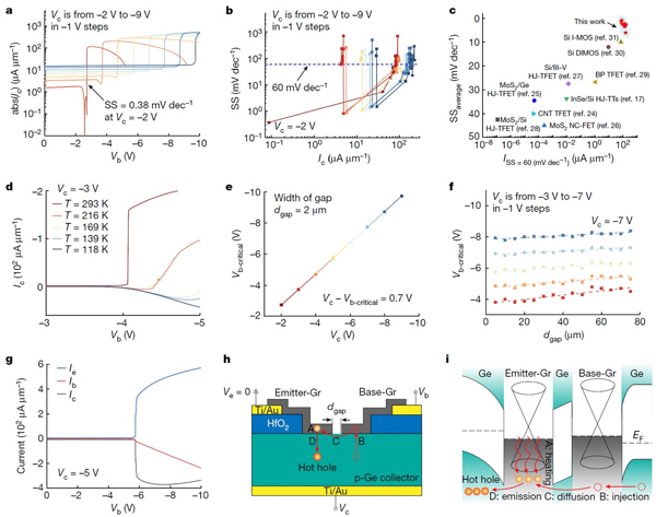 图2. 超低亚阈值摆幅特性和受激发射机制。a. 转移特性曲线;b. 亚阈值摆幅与电流关系图;c. 亚阈值摆幅性能对比图;d. 转移特性中电流的温度依赖性;e. 临界基极偏压与集电极偏压关系图;f. 临界基极偏压与缝隙宽度关系图;g. 发射极电流与基极偏压关系图;h. 载流子在晶体管中的流向图;i.器件能带图。