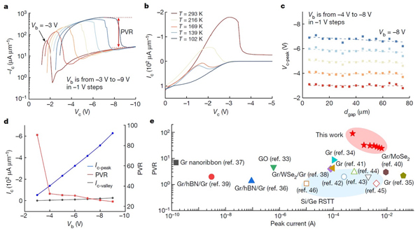图3. 负微分电阻。a. 输出特性曲线;b. 输出特性中电流的温度依赖性;c. 峰值电流偏压与缝隙宽度关系图;d. 峰谷电流比;e. 峰谷电流比性能对比图。