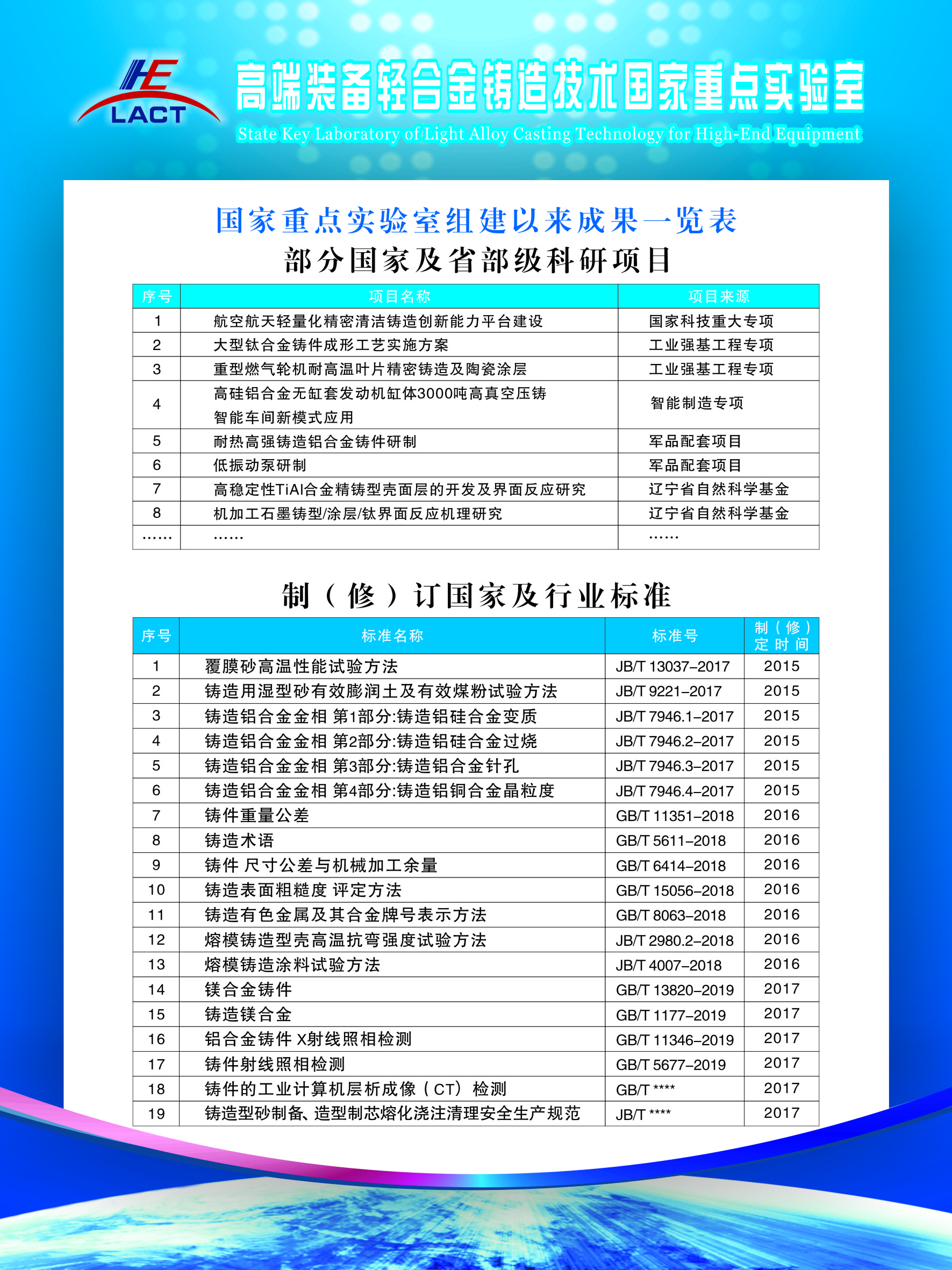 实验室拥有铝镁合金先进铸造技术;钛合金先进铸造技术;特种合金先进铸造技术;绿色快速铸造技术;轻合金高端铸件检测技术5个研究方向。实验室紧密围绕铸造行业未来需求,开展高端装备轻合金铸造过程应用基础理论和竞争前共性技术的研究,制修订铸造行业国家标准和行业标准,聚集和培养优秀铸造专业人才,引领和带动我国铸造行业技术进步。建设完成后,实验室在轻合金铸造技术领域将达到国内领先、国际一流的水平。