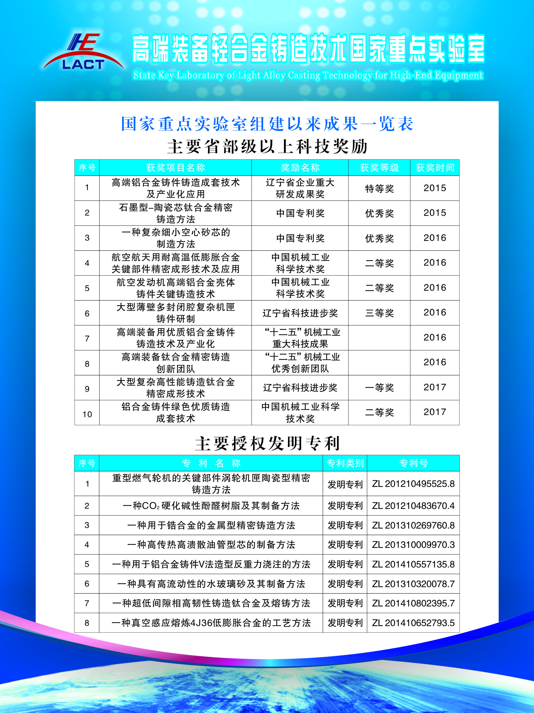 高端装备轻合金铸造技术国家重点实验室依托沈阳铸造研究所,于2015年9月获得国家科技部批准建设。实验室位于辽宁省沈阳市铁西区云峰南街17号,现有科研用房建筑面积约10000平方米,拥有实验、检测设备120余台/套,科研资产约1.1亿元。