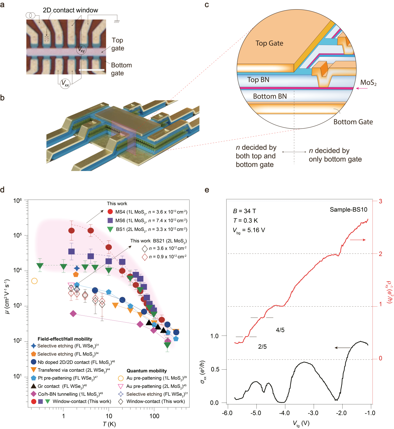 研究人员将硫化钼少层晶体用氮化硼进行封装,其中顶部氮化硼薄层采用预图案化的二维微米尺寸窗口进行铋电极热蒸发接触。所得器件在较低载流子浓度即可具有全温区(毫开尔文至室温)欧姆接触和高迁移率(图1)。在毫开尔文温度、强磁场下观测到填充系数niu=1的量子极限和⅖、⅘填充的分数量子化横向电导平台。这是目前能够通过电输运(非拓扑平带体系)观测到分数量子霍尔效应的首个二维本征带隙n型半导体材料。该实验结果为基于二维半导体的低温高迁移率电子晶体管(HEMT)、低温放大器等纳米电子学器件提供了可能方案。