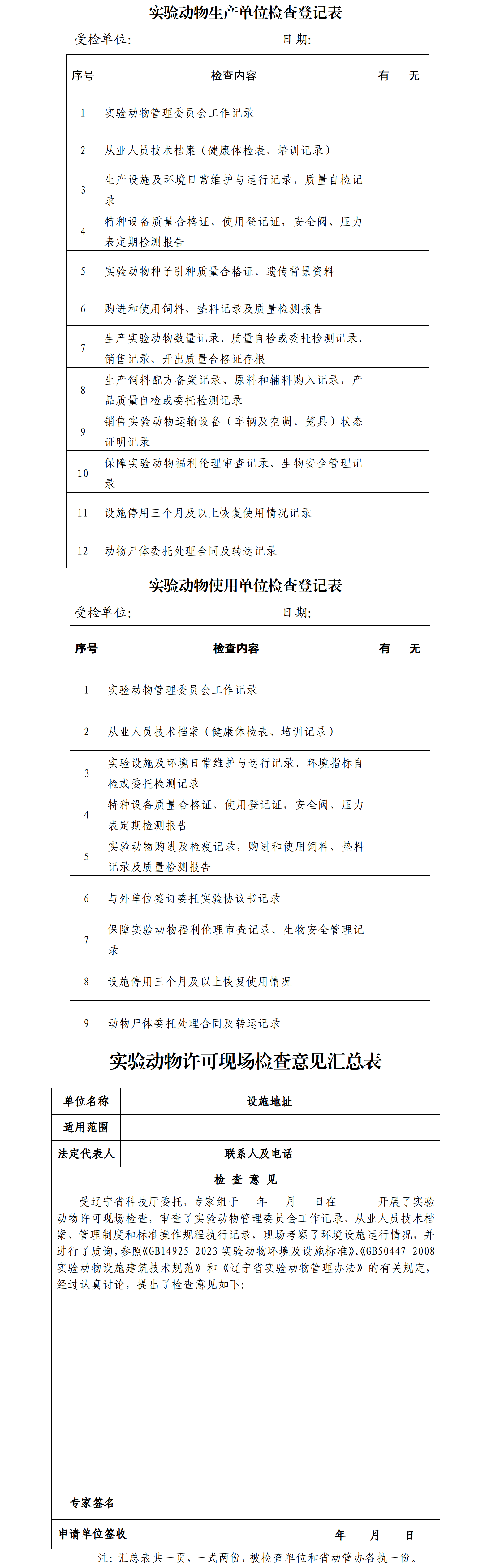 实验动物生产单位检查登记表