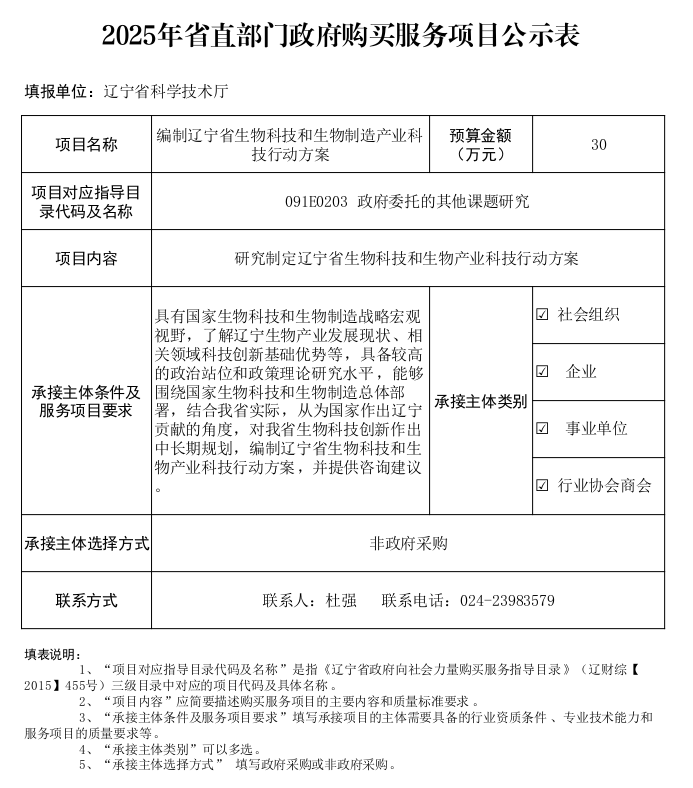 2025年省直部门政府购买服务项目公示表(编制辽宁省生物科技和生物制造产业科技行动方案)